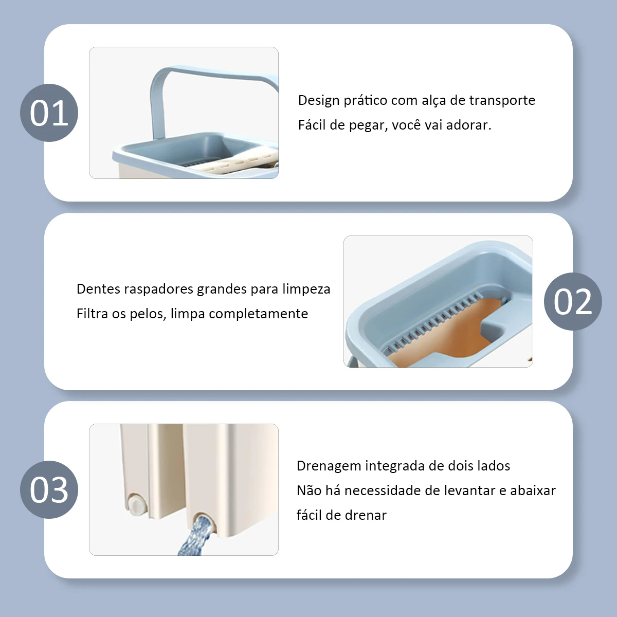 Ideal para ambientes compactos, com uma base articulada que alcança até os cantos mais difíceis de limpar, oferecendo maior absorção e durabilidade. Elimina o contato das mãos com água e produtos de limpeza.